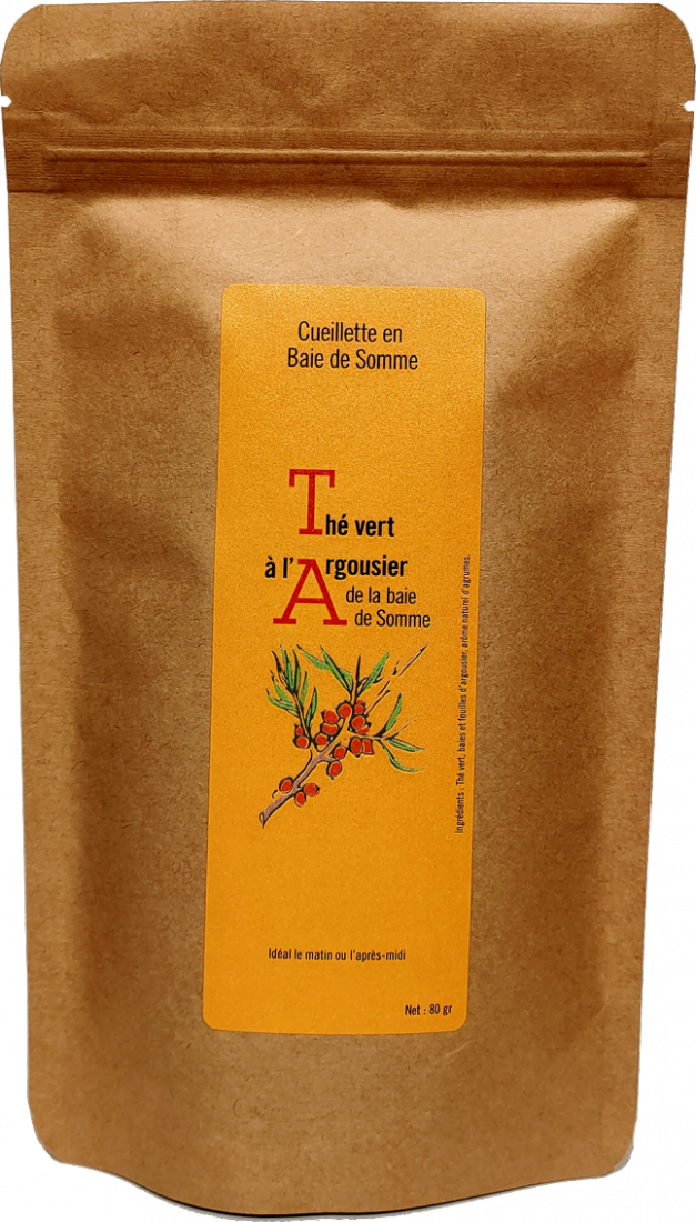 Ingrédients : thé vert du Japon, baies et feuilles d'argousier sauvage de la baie de Somme (12%), écorces d'agrumes.